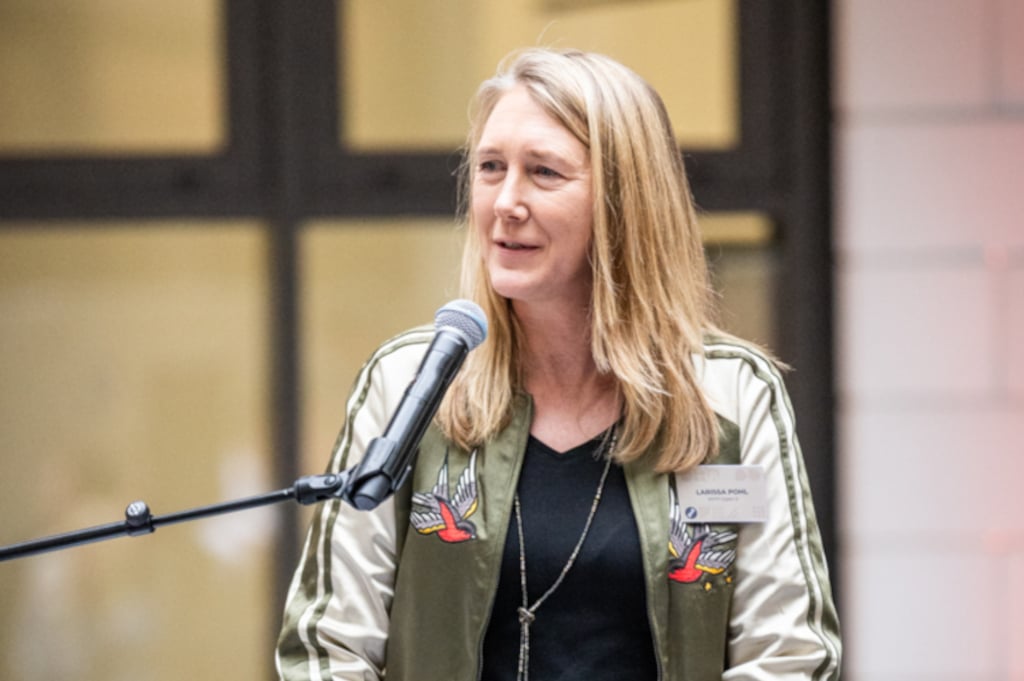 GWA Präsidentin Larissa Pohl sprach beim Empfang auch über aktuelle gesellschaftliche Entwicklungen und Fake-News. (Bild: Gesche Jäger)