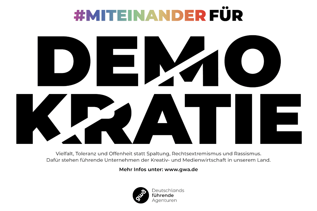 In Partnerschaft mit Medienhäusern, Verlagen, Verbänden und Außenwerbern hat der Branchenverband GWA die Kampagne „#Miteinander für Demokratie“ gestartet, die sich gegen Hass, Hetze, Diskriminierung und Demokratiefeindlichkeit stelle und für Demokratie, Zusammenhalt und Toleranz werbe.