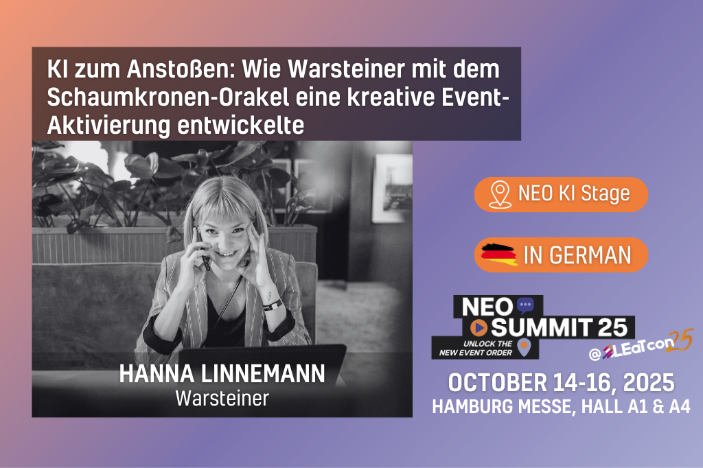 Künstliche Intelligenz kann mehr als nur Prozesse optimieren – sie kann zu einem interaktiven Erlebnis für Besucher werden. Auf dem NEO Summit 25 zeigt Hanna Linnemann, Warsteiner, wie das Schaumkronen-Orakel KI auf Events kreativ einsetzt, um Emotion, Interaktion und Markenbindung zu schaffen.