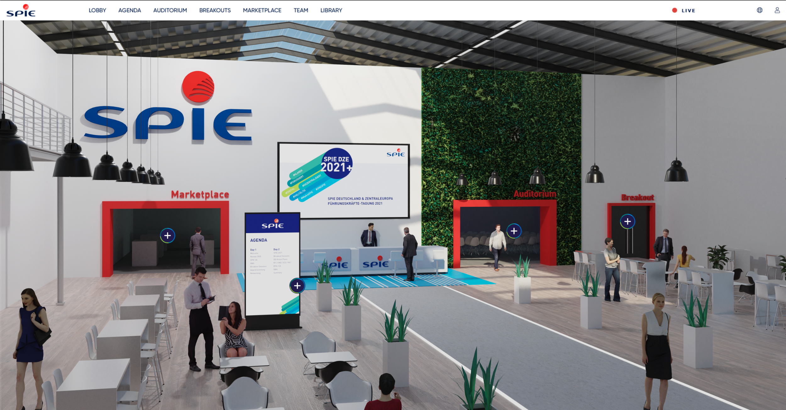 Das Herzstück der Veranstaltung für SPIE bildete eine digitale Plattform mit unterschiedlichen Bereichen: Auditorium, Breakout-Sessions und Marketplace. Während im Auditorium die Vorträge stattfanden, die per Live-Stream übertragen wurden, konnten in den Breakout-Sessions verschiedene Themen im kleineren Rahmen diskutiert werden. Der Marketplace bot eine virtuelle Messe mit 15 Ständen zu wichtigen aktuellen Themen des Unternehmens. Realisiert wurde das Event gemeinsam mit der Medientechnik-Sparte von SPIE Deutschland & Zentraleuropa und dem Berliner Technik-Partner Lautwerfer, der die Plattform entwickelt und auch bei der technischen Durchführung unterstützt hat.