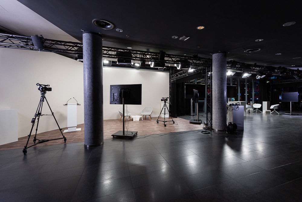 Tammo Buhren von zweiB: „Ich habe in den letzten 15 Jahren zahlreiche Events im Kino im Sony Center erlebt und freue mich, diesen einzigartigen Standort neu zu entdecken. Jetzt bietet sich die einmalige Chance, mit schlagkräftigen Partnern den Ort Kino neu zu definieren und individuelle Konzepte für virtuelle, hybride und Live-Events umzusetzen. Im Studio sorgen wir zusätzlich mit mindestens zwei Kamerazügen für abwechslungsreiche Studio-Perspektiven und über zwei 85″-Monitore lassen sich Remote-Speaker, Folien und Logos einblenden. Das Set-Design ist mit Barhockern, Brückentischen sowie Sesseln für verschiedene Formate bereits vor Ort ausgestattet und kann an individuelle Bedürfnisse angepasst werden.“