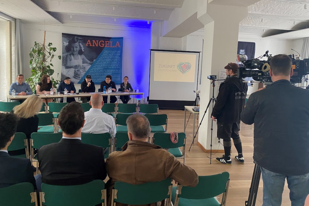 Pressekonferenz zum Bündnis Zukunft Deutschland – auf dem Podium (v.l.n.r.): Martin Behns (Geschäftsführer der Privaten Berufsschule für Medientechnik | b-trend-setting), Nicole Behr (Vorständin IGVW und IPGV e.V. | Ansprechpartnerin Kommunikation), Marcel Fery (Vorstand TSE AG, Mitglied fwd: Bundesvereinigung Veranstaltungswirtschaft e.V.), Holger Werner (Vorstand WARRIORS KDM e. V.), Marcus Pohl (Präsident IGVW und Vorstandsvorsitzender ISDV e.V.) und Isabell Halletz (Geschäftsführerin des Arbeitgeberverbandes Pflege e.V.) (Bild: Zukunft Deutschland)
