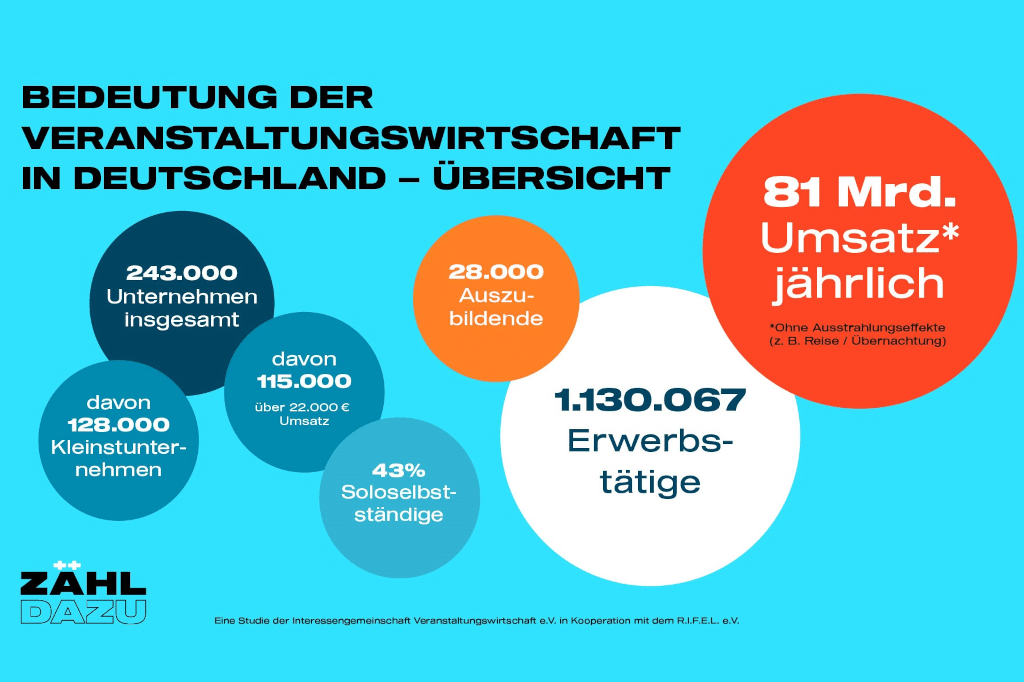 Laut der von der IGVW beauftragten und von der TU Chemnitz in 2021 durchgeführten Studie „Landkarte der Veranstaltungswirtschaft“ zähle die Branche mit gut einer Million Beschäftigen, 243.000 Betrieben und einem Gesamtumsatz von 81 Mrd. Euro zu den sechstgrößten Wirtschaftszweigen Deutschlands. Gleichzeitig fehlen durch die Coronajahre und die bereits davor bestehenden personellen Anforderungen aktuell rund 400.000 Mitarbeitende in den heterogenen Tätigkeitsfeldern der Eventbranche.