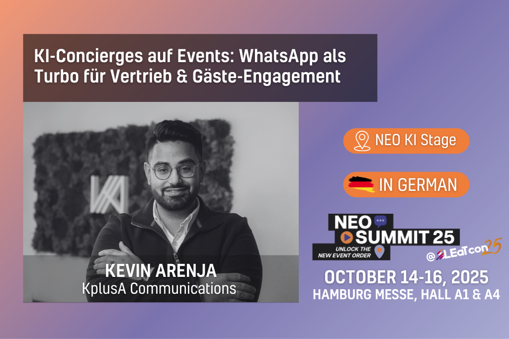 Künstliche Intelligenz verändert nicht nur die Eventplanung, sondern auch das Gästeerlebnis und den Vertrieb. Auf dem NEO Summit 25 zeigt Kevin Arenja, KplusA Communications, wie KI-Concierges via WhatsApp Events effizienter machen, die Teilnehmerzufriedenheit steigern und den Vertrieb messbar unterstützen.