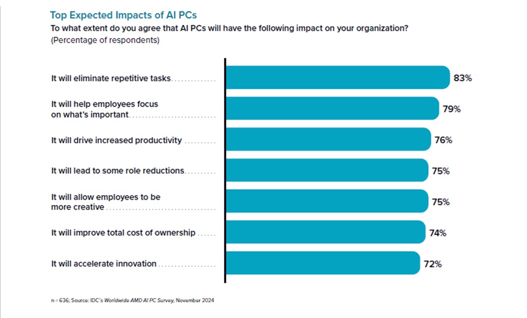 Von KI-PCs erhoffen sich die Führungskräfte vor allem, dass die Mitarbeiter von Routinearbeiten entlastet werden und ihre Produktivität steigt (Bild: IDC/AMD)