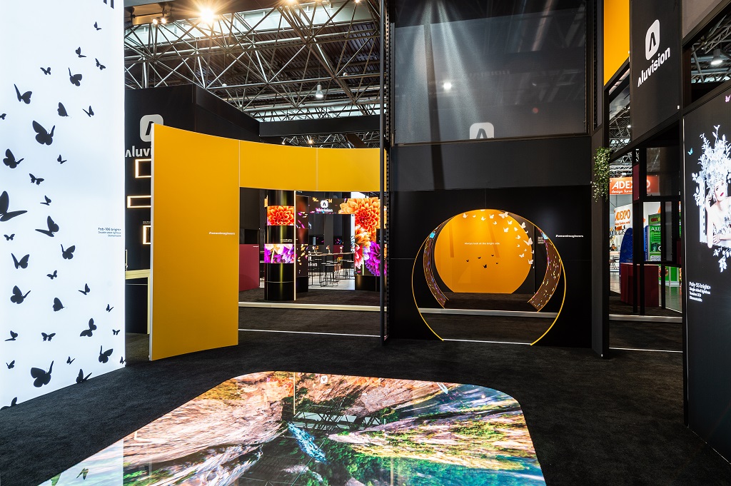 Mit einem großen, begehbaren, auf einer Seite geöffneten LED-Würfel, einem interaktiven LED-Boden und einem LED-Tunnel sorgte Aluvision für einige instagrammable Momente und Motive. Die 15 neuen Produkte integrierte Aluvision in den Stand selber, um diverse Design-Möglichkeiten aufzuzeigen oder präsentierte diese in speziellen „Produkt-Ecken”