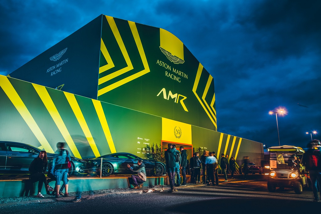 Für seine zweite Saison in der Langstrecken-Weltmeisterschaft (WEC) hat der Aston Martin Vantage AMR ein neues Farbkleid erhalten: Nach dem knalligen Gelb in der vergangenen Saison blieb die Signalfarbe als Grundton zwar erhalten, sie wurde jedoch im Heckbereich durch das legendäre British Racing Green ergänzt. Für die Inszenierung seiner Markenbotschaften nutzte Aston Martin eine mehrgeschossige Hospitality-Location von Losberger De Boer und iEvents. Die modulare Raumlösung wurde individuell auf die Bedürfnisse des Automobilherstellers angefertigt und eingerichtet. So entstand am Rande des 24 Stunden Rennens eine VIP-Hospitality, in der die Markenwelt von Aston Martin für die Besucher multisensorisch erlebbar wurde.