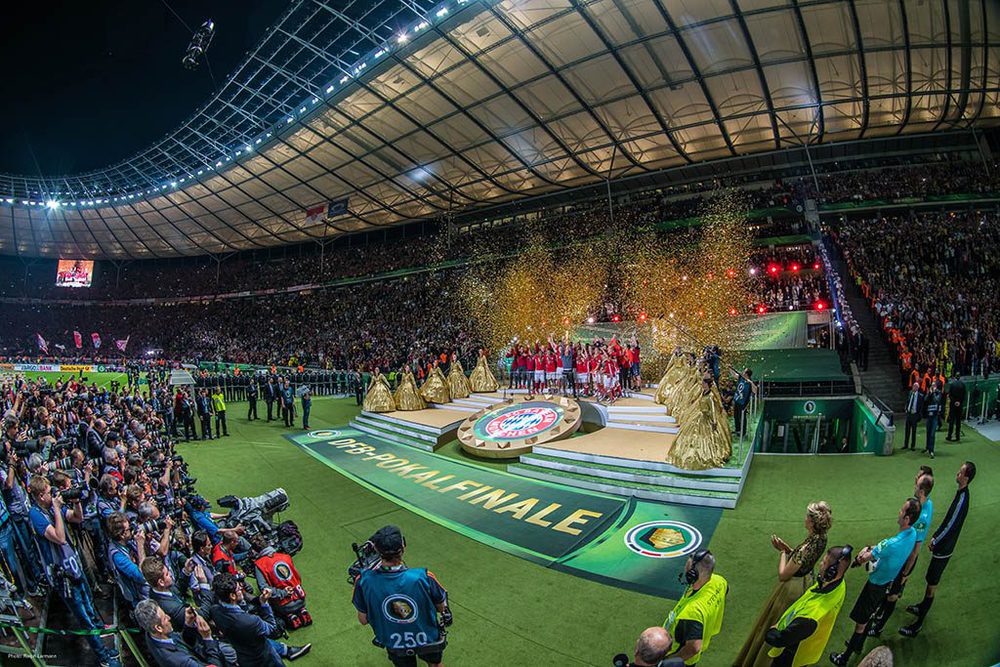 Ein Woche später, dann das nächste große Fußballevent: Am 21. Mai standen sich die zwei besten Teams des DFB Pokalwettbewerbes zum Endspiel in Berlin gegenüber: FC Bayern München gegen Borussia Dortmund. Im Elfmeterschießen, konnten die Bayern das Spiel für sich entscheiden. Die Freude der Mannschaft über den Pokalsieg erreichte durch die begleitende Inszenierung von Lunatx SFX ihren Höhepunkt. Das Lunatx Team montierte an 95 Positionen der Dachkante des Olympiastadions 760 LX Shooter und platzierte am Podest für die Siegerehrung 20 Kabuki Shooter und zwei LX CO² Blaster, aus denen punktgenau zum Cuplift Goldflitter über die feiernden Spieler schossen.