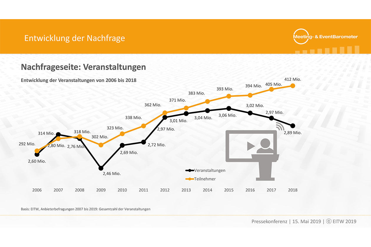 Gemessen an der Gesamtzahl der Teilnehmer von Tagungen, Kongressen und Events in Deutschland sind Veranstaltungen laut Meeting- & EventBarometer 2018/2019 weiterhin ein Wachstumsmarkt. Die Analyse verzeichnet hier ein Plus von 1,6 Prozent auf insgesamt rund 412 Millionen Teilnehmer. Im Rahmen eines Trends, der sich bereits in den Vorjahren abgezeichnet hat, verteilen sich diese Teilnehmer auf eine geringere Zahl an Veranstaltungen. Für diese Verschiebungen, von denen in einem insgesamt zunehmend heterogenen Markt vorwiegend mittlere bis größere Veranstaltungen profitieren, sorgt unter anderem der Einsatz neuer Technologien.