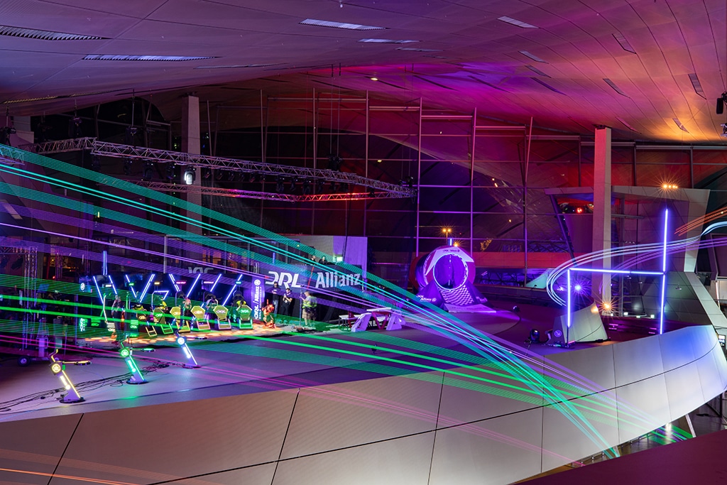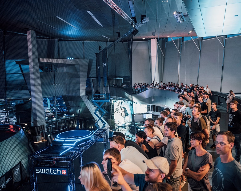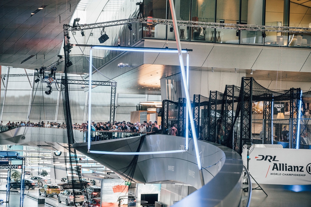 Am vergangenen Samstagabend blieb die BMW Welt für Besucher geschlossen. Aus gutem Grund: Mit weit über 100 Stundenkilometern jagten zwölf Piloten der Drone Racing League (DRL) ihre Renndrohnen durch einen Wettkampf-Kurs im Inneren des Gebäudes, mitten durch die Fahrzeugausstellung. Über 3.000 begeisterte Gäste verfolgten das Trendsport-Spektakel live. 1000 Fans fanden auf den Publikumsrängen in der BMW Welt Platz, mehr als 2.000 versammelten sich dank bestem Sommerwetter in der kostenlosen Outdoor-Fan Zone zum Public-Viewing.