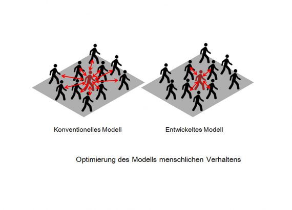 Die Berechnung basiert auf dem Hochgeschwindigkeitsmodell für menschliches Verhalten zur Simulation von Personenströmen des japanischen Forschungszentrums RCAST.