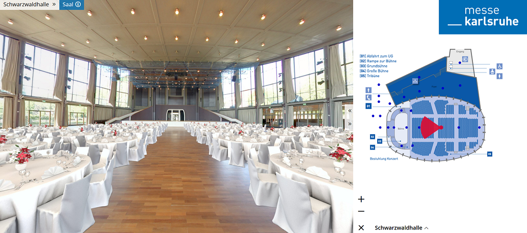 Die Messe Karlsruhe bietet ihren Kunden einen Weg, das im Herzen der Karlsruher Innenstadt gelegene Kongresszentrum und das weitläufige Messegelände in Rheinstetten zu besichtigen: Mittels originalgetreuer 360°-Aufnahmen können Veranstalter und Organisatoren die Hallen und Räume vom eigenen Schreibtisch aus virtuell begehen – ein digitales Angebot, das Zeit und Kosten sparen und die Planung zukünftiger Live-Events erleichtern soll sowie in diesen Zeiten überhaupt erst möglich macht.
