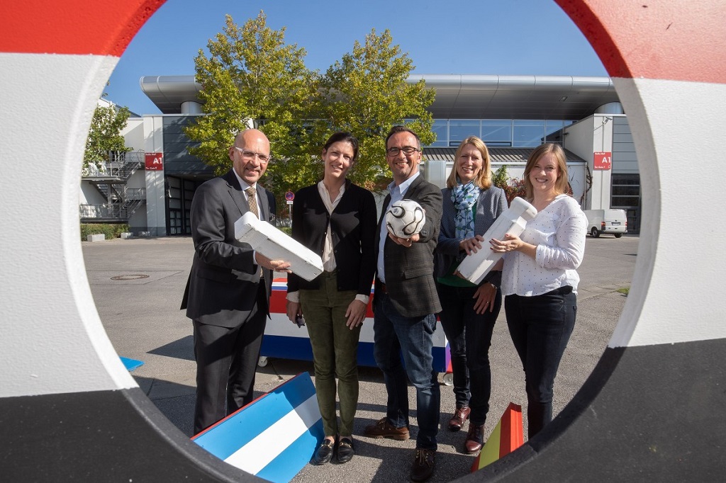 Klaus Dittrich, Viktoria von Wulffen, Norbert Blesch, Birgit Treml und Julia Sicheneder bei der Übergabe der Fußballgolf-Anlage(Bild: Oliver Bodmer/Messe München)