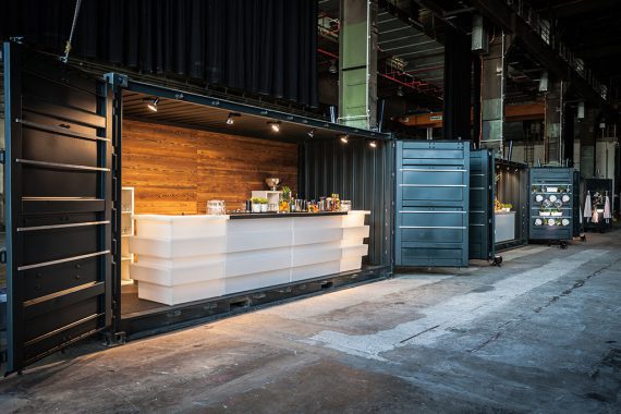 In der Halle 45 stehen auch die vier High-Cube-Überseecontainer, die als mobile Live-Cooking-Stationen, Bars, Raumtrenner oder einfach als Show-Case vermietet werden. Echte Eventmodule, flexibel und deutschlandweit einsetzbar.