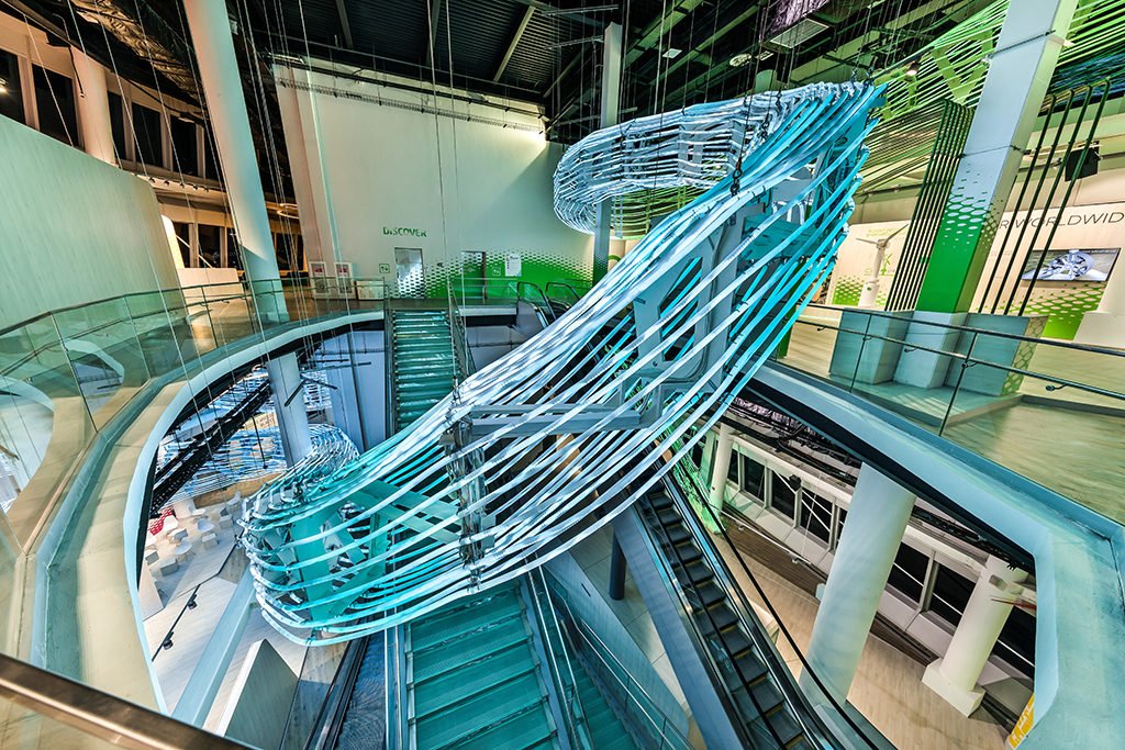 Neun Kilometer LED-Stripes für die Lichtskulptur „Energy Stream“ Der „Energy Best Practice“-Pavillon war das symbolische Zentrum dieser Expo und stellte zukunftsweisende Technologien sowie verschiedenste Bereiche nachhaltiger Energieformen aus. Aufgeteilt in sechs Themenbereiche auf zwei Stockwerken war die Lichtskulptur „Energy Stream“ das verbindende Element in diesem Pavillon. Jeweils 30 parallel verlaufende Splines aus insgesamt 9.000 Meter RGB-LED-FlexStrips bildeten dessen Form. Jeder Pixel war einzeln ansteuerbar und wurde mit Hilfe einer Pixelmapping-Software mit animiertem Content bespielt. Die gesamte Ansteuerungstechnik wurde von Robin Agarwal (N&M Düsseldorf) eigens für dieses Projekt inhouse entwickelt und geplant; einige Bauteile sind Sonderanfertigungen, die nach N&M-Vorgaben produziert wurden. Backbone der Steuerungstechnik war ein redundant aufgebautes Glasfaser-Netzwerk.