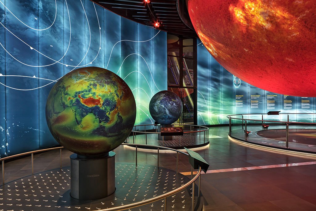 Die insgesamt acht Etagen in dem gläsernen Bauwerk widmeten sich jeweils verschiedenen Formen erneuerbarer Energie. Architektonisch verbindendes Element war die „Wall of Future“, die gleichzeitig den Ausstellungsbereich von den lichtdurchfluteten Innenhöfen separierte. Über 800 Steglos-Displays (55 Zoll) boten Informationen zu den einzelnen Themengebieten. So erwartete den Besucher im Innenraum einer begehbaren, 13 Meter durchmessenden Sonnenkugel eine 360-Grad-Projektion, die von zehn 30k- und weiteren vier 13k-Laser-Projektoren realisiert wurde. Die eindrucksvolle Bilderwelt erzählte vom Einfluss der Sonne auf das Leben. Mit LED-Flutern, Projektionen und bedruckten Elementen wurden die Aktivitäten auf der Sonnenoberfläche simuliert. Während der „Kinetic Energy Show“ auf Ebene 3 bedienten Artisten das „Wheel of Life“ – in Szene gesetzt von 38 Moving-Lights, die in einer Timecode-gesteuerten Show-Sequenz programmiert waren.