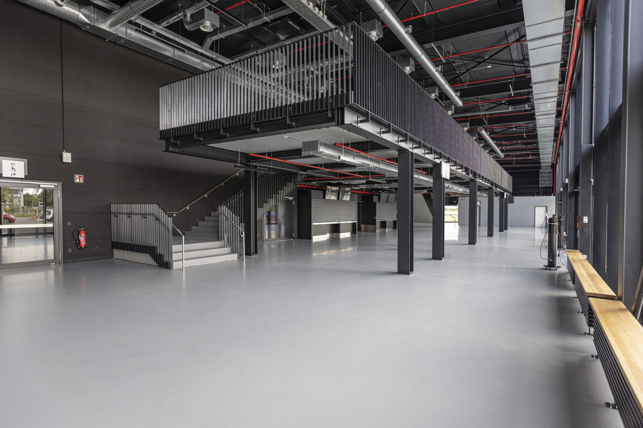 Bereits bei der Planung stand die multifunktionale Nutzung der Eventhalle im Zentrum. Parallel zur Eventhalle erstreckt sich ein zweigeschossiges Nebengebäude mit je knapp 1060 m2 Grundfläche. Hier sind mehrere Funktionsräume untergebracht, die sich spieltags- und eventbezogen nutzen lassen; also beispielsweise als Garderoben, als Büro für das Konzertmanagement oder für Pressekonferenzen. Daneben steht der VIP-Raum mit vollausgestatteter Küche bis zu 200 Gästen und für Caterings zur Verfügung. Vom VIP-Raum aus gelangen die Gäste via direkten Übergang zu ihren VIP-Sitzplätzen auf der Tribüne.