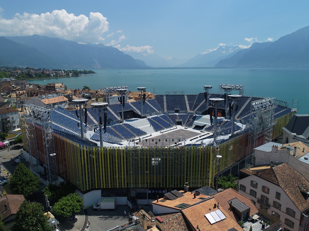 Dabei überzeugt die Arena auch dank der Tribünenanlage auf einem Stahlträgerrost in knapp sechs Meter Höhe. „Die Zuschauer auf dem obersten Rang befinden sich auf fast 20 Meter über dem Boden“, sagt Peter Tanner, COO Events Nüssli Gruppe und ergänzt: „Sie genießen damit eine uneingeschränkte Sicht auf das Geschehen auf der Bühne. Für uns allerdings bedeutete diese Spezialkonstruktion eine Herausforderung für die Montage und sie erforderte eine absolut durchdachte Materiallogistik.“