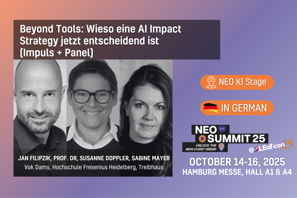 Künstliche Intelligenz verändert unsere Arbeitswelt radikal – und wer nur auf neue Tools und Automatisierungen schaut, übersieht das große Bild. Auf dem NEO Summit 25 diskutieren Jan Filipzik (Vok Dams), Prof. Dr. Susanne Doppler (Hochschule Fresenius Heidelberg) und Sabine Mayer (Treibhaus) im Panel, wie Unternehmen sich strategisch auf die tiefgreifenden Veränderungen vorbereiten und eine AI Impact Strategy entwickeln können, die Orientierung über kurzfristige Effizienzgewinne hinaus bietet.