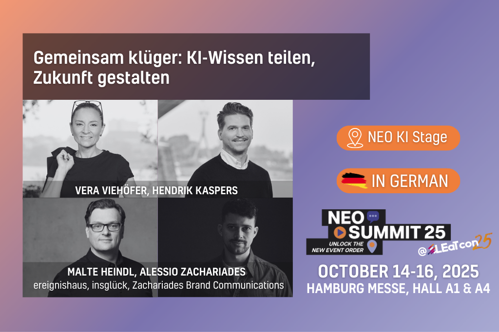 Künstliche Intelligenz ist längst mehr als ein Trend – sie verändert die Veranstaltungswirtschaft nachhaltig. Auf dem NEO Summit 25 bringt das Panel Expert:innen zusammen, die ihr Wissen nicht nur im eigenen Unternehmen einsetzen, sondern aktiv über Grenzen hinweg teilen.