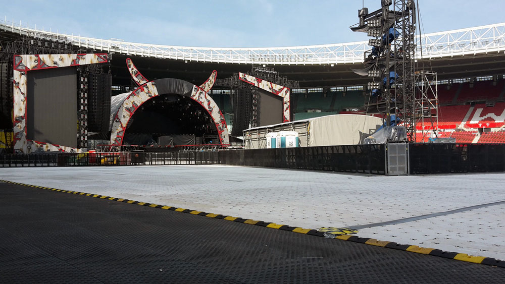 Für einen festen Stand der Rockfans und den Schutz des empfindlichen Stadionboden, sorgten verschiedene Rasen- und Bodenschutzsysteme von eps. Unter anderem 7.700 m² des Rasenschutzsystems Supa-Trac und 3.700 m² Portafloor. Des Weiteren wurden für eine optimale Lastenverteilung 2.400 m² Arena Panels und als zusätzliches Bodenschutzsystem 4.100 m² Remopla Schwerlastplatten, beides inklusive Rampen, für barrierefreie Wege verlegt.