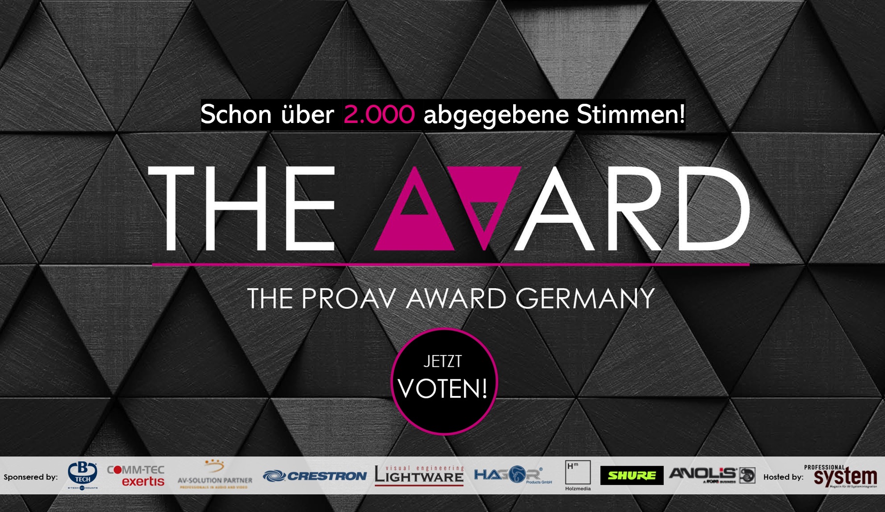 Zukunftsweisende Produkte und Lösungen haben eine Ehrung verdient. Daher hat PROFESSIONAL SYSTEM mit The AVard den ersten ProAV Award in Deutschland ins Leben gerufen. Zahlreiche innovative Produkte wurden nominiert, die aktuell von der Community in einem Leservoting bewertet werden können. Außerdem sind mehrere herausragende Projekte eingereicht worden, über die eine Fach-Jury tagt.