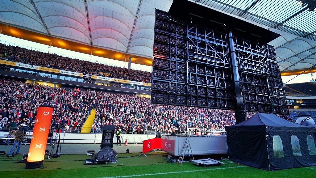 Während die Eintracht Frankfurt beim Rückspiel gegen den FC Chelsea in London antrat, fieberten zahlreiche Fans in Frankfurt mit. Nachdem Screen Visions beim letzten Public Viewing in der Commerzbank-Arena im September noch einen 100 m² großen Screen einsetzte, konnten die Fans das Spiel nun auf 144 m² aktiver Bildfläche verfolgen.