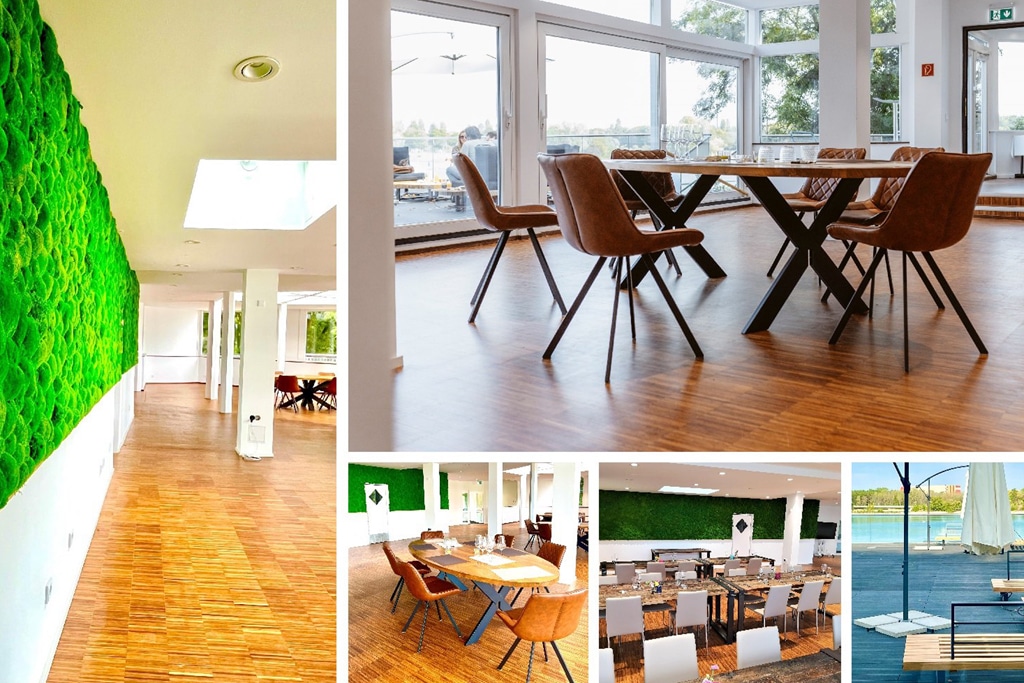 Eine lebende grüne Mooswand, ein heller Bambusboden und ein Kamin sorgen für ein naturnahes Ambiente, das sich mit 150m² Indoorfläche für Events, Hochzeiten, Präsentationen oder Weihnachtsfeiern eigne. Für große Sommerfeste können die beiden Ebenen der Strandlocation zu einer Fläche von über 800m² zusammengefasst werden. Entspannung mit Sicht auf den Fühlinger See verspreche die 350m² große Terrasse.