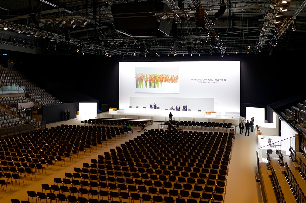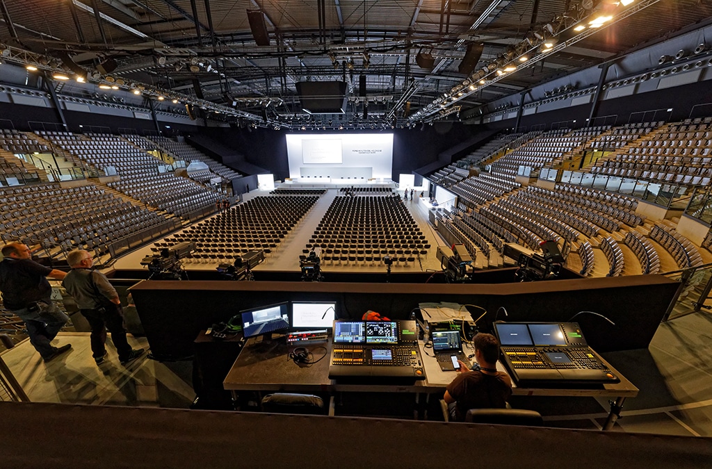 Im Rahmen der diesjährigen Aktionärsversammlung der Porsche Automobil Holding SE in Stuttgart testete Neumann&Müller Veranstaltungstechnik das „Soundscape“-System von d&b audiotechnik im Praxiseinsatz. Ergänzend zu den technischen Lösungen, die N&M für den absolut sicheren Ablauf der Veranstaltung in der Porsche Arena konzipierte und einsetzte, installierten die Techniker das neue DS100-System sowie die dafür nötigen zusätzlichen Lautsprecher. Es steht für eine optimale Ortung der Redner an ihren Positionen auf und – wie im Fall der Porsche SE Hauptversammlung – auch neben der eigentlichen Bühne.