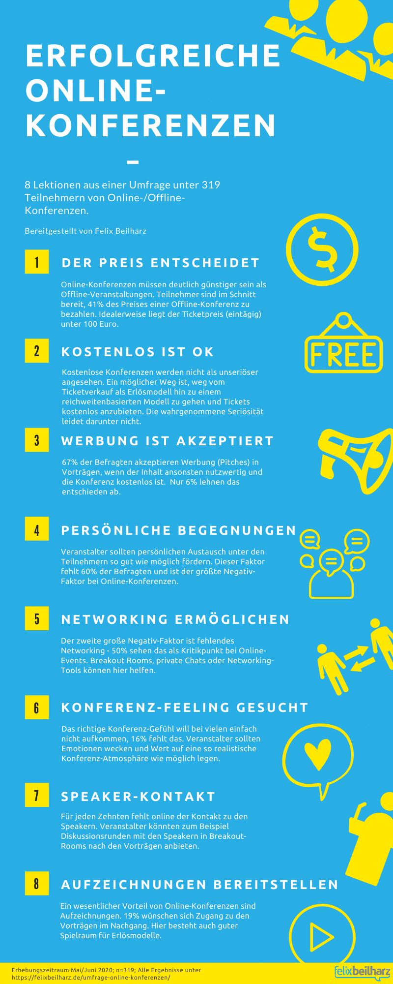 Aufgrund von Corona werden derzeit Konferenzen verstärkt digital durchgeführt. Eine Veränderung, die nicht nur technisch herausfordernd ist, sondern auch hinsichtlich der Nachfrage. Aufschluss darüber, was Teilnehmer bereit zu zahlen sind und wie sie sich auch online begeistern lassen, gibt eine aktuelle Umfrage von Felix Beilharz, Redner und Berater für Online- und Social Media Marketing. Zusätzlich zu den Ergebnissen, leitet er auch hilfreiche Tipps für Veranstalter ab – beides wird nachfolgend vorgestellt.