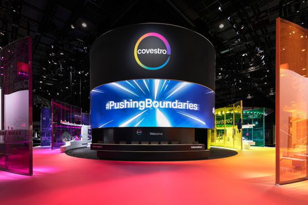 Covestro nahm die Besucher mit auf eine Reise in eine Welt aus visionären Entwicklungen und innovativen Materiallösungen. Abgeleitet aus dem farbenfrohen, kreisrunden Logo des Leverkusener Konzerns, tauchte der Besucher in sechs unterschiedliche Farbwelten ein, die stellvertretend für verschiedene, führende Industrien standen. Ausgewählte Exponate und Anwendungsbeispiele zeigten die Vielfältigkeit und Innovationskraft der Covestro-Materialien. Ein individuell konzipiertes Motion Design rundete das 360-Grad Konzept mit abstrakten Grafiken und Markenbotschaften ab, die auf einer kreisförmig angeordneten, 45 Meter langen LED-Wand bereits von weitem die Aufmerksamkeit der Messebesucher auf sich zog.
