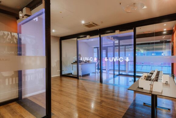 Die UV-C-Virenschutzwand kann als unsichtbarer Raumteiler genutzt werden und größere Räume in kleinere “virtuelle” Räume unterteilen, die so lufttechnisch isoliert sind. Damit kann sie kann ein wichtiger Teil eines Aerosol-Hygienekonzepts für Räume und Gebäude werden.
