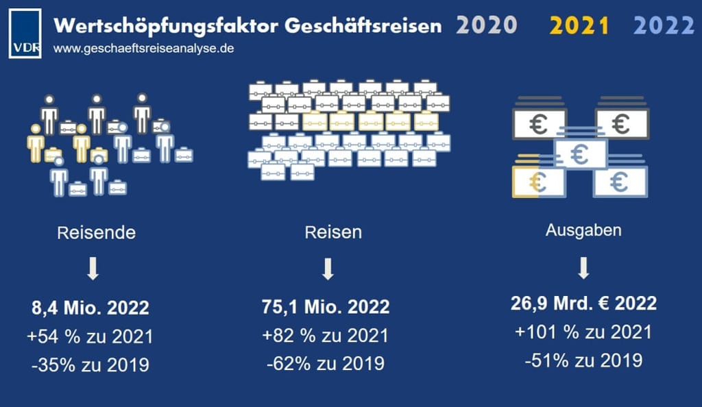 Nachdem die Auswirkungen der Pandemie die Reisebranche im Jahr 2020 quasi zum Erliegen gebracht hatten, kam es bereits 2021 zu einem Wiederanstieg der Geschäftsreisen. Dieser Aufwärtstrend konnte auch 2022 fortgesetzt werden. Hier zeigte sich zum einen ein gewisser Nachholbedarf infolge von Corona-Lockdown und weiteren Einschränkungen, zum anderen mache diese Entwicklung deutlich, dass Geschäftsreisen weiterhin notwendig für die deutsche Wirtschaft sind. Im Ergebnis kam es im Jahr 2022 im Vergleich zu 2021 zu einer Steigerung von 82% und damit insgesamt zu 75,1 Millionen Geschäftsreisen.