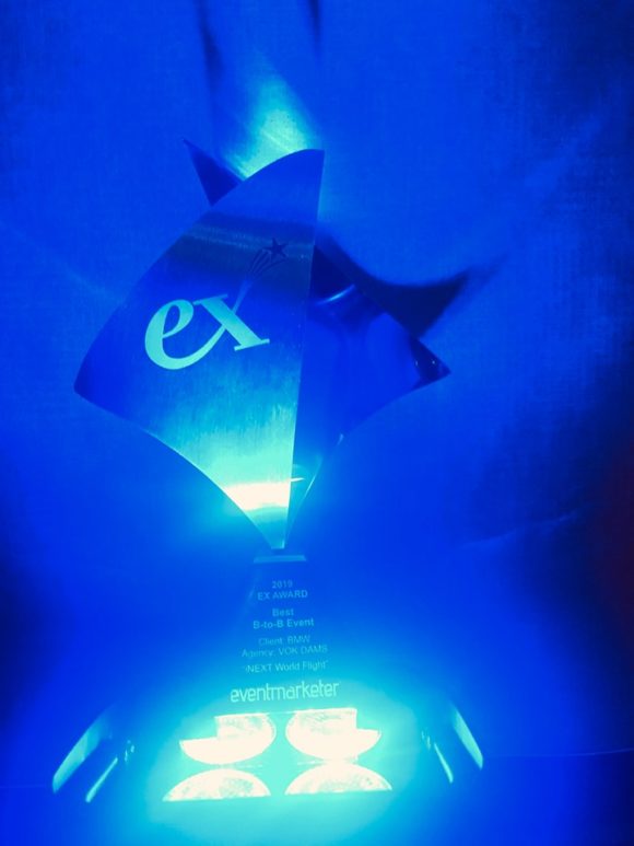Dieses Projekt konnte auch die Jury des Ex Award überzeugen, die in der Kategorie Best B-to-B Event die Auszeichnung an die Agentur für Events und Live-Marketing VOK DAMS vergaben. Daher hieß es dann am Abend in Las Vegas: “And the EX Award goes to BMW Vision iNEXT World Flight“
