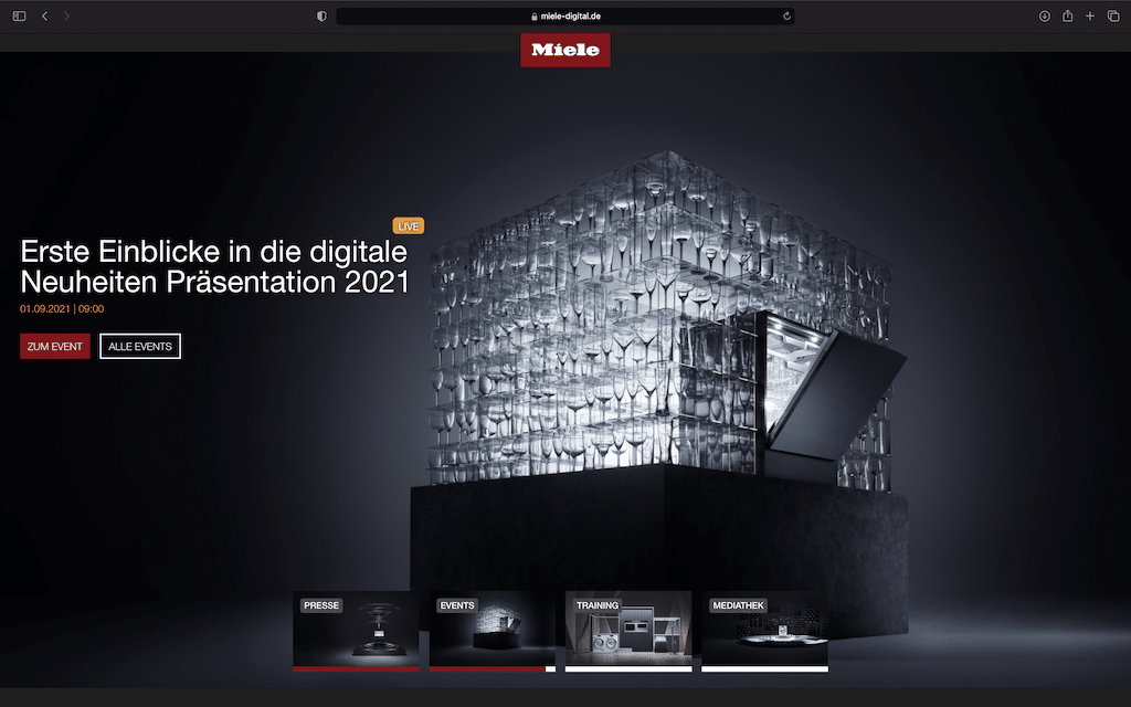 Für die „Miele Digitale Neuheiten Präsentation“ kam die „Vok Dams Open Platform for Hybrid Trade Fairs“ zum Einsatz, eine individualisierbare Plattform-Lösung, die geladenen wie auch öffentlichen Besucher:innen eine zeitgemäße digitale Brand Experience mit einer Vielzahl von Möglichkeiten für Information, Interaktion, Partizipation und den Austausch mit Expert:innen geboten hätte.