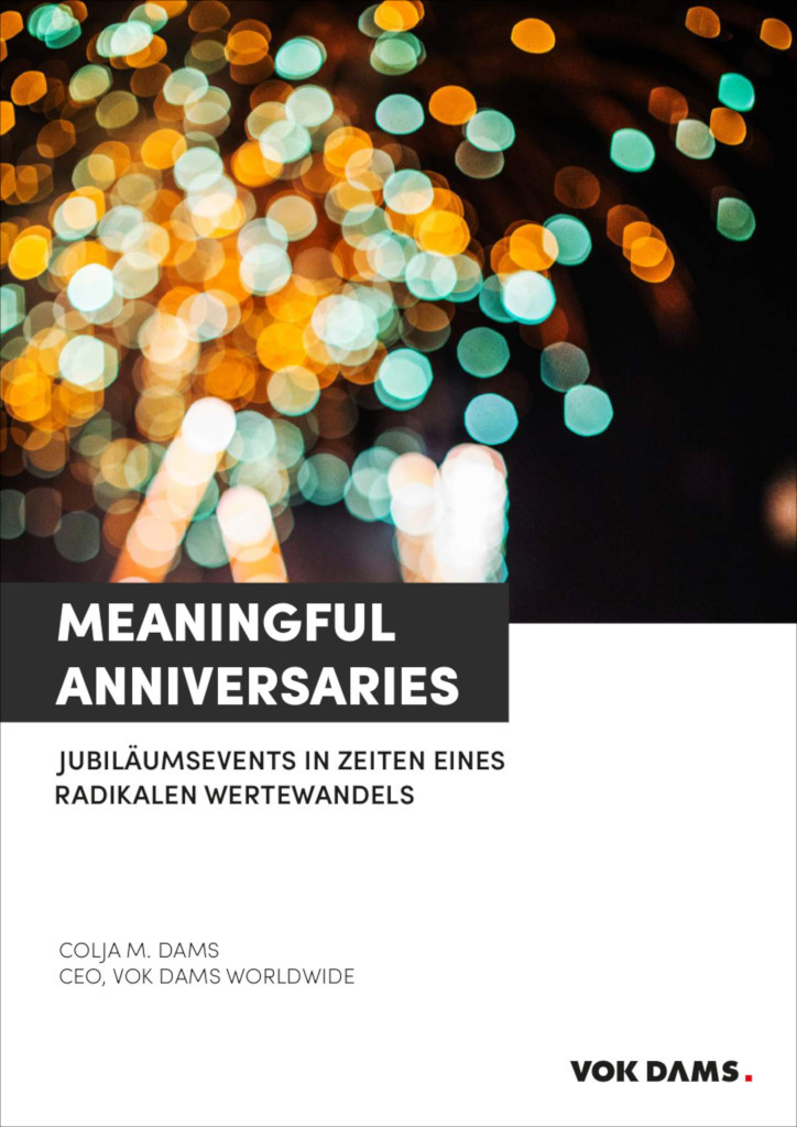 Vok-Dams_Meaningful_Anniversaries.2019Vok Dams gibt mit „Meaningful Anniversaries“ einen Einblick in die strategische Planung des Jubiläumsevents der 20er Jahre dieses Jahrhunderts. Die Agentur zeigt auf, wie sich die Bedürfnisse der Zielgruppen durch die Digitalisierung verändert haben und wie sich das auf die Konzeption eines Jubiläumsevents auswirkt.