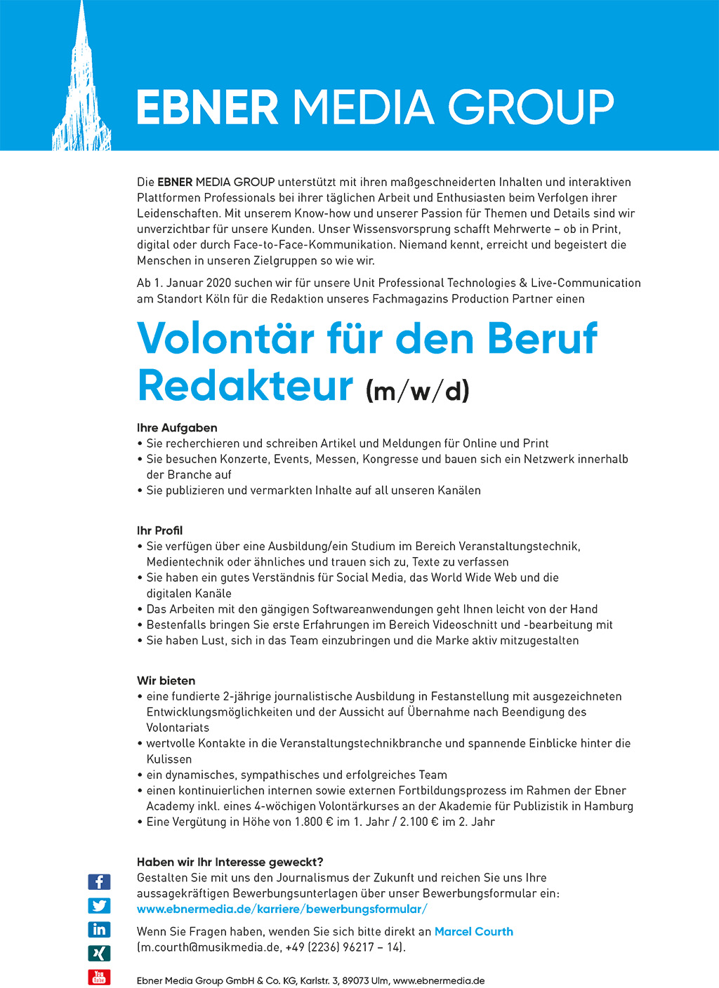 In eigener Sache Wir suchen einen Volontär (m/w/d) für den Beruf Redakteur von Redaktion, 5. November 2019 Anzeige Sie möchten sich bewerben? Hier geht es direkt zu unserem Bewerbungsformular. Schlagwörter: ProMediaNews Schreiben Sie einen Kommentar Antworten abbrechenIhre E-Mail-Adresse wird nicht veröffentlicht. Erforderliche Felder sind mit * markiert.Kommentar * Name * E-Mail * Datenschutzbestimmungen Das könnte Sie auch interessieren mac. brand spaces steigert Umsatz auf über 140 Millionen Euro Weiterlesen Stagnierende Budgets und deutliche Auswahlhürden für Locations Weiterlesen LEaT X 26: Ticketverkauf gestartet Weiterlesen Ohne Bullshit zum Deal – Erfolgreich verkaufen Weiterlesen Tobias Weber in IHK-Ausschuss berufen Weiterlesen Rückblick auf die erste MICE Connect im Pfalzbau Ludwigshafen Weiterlesen