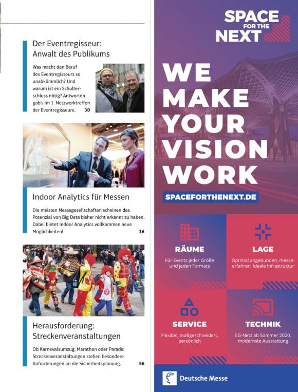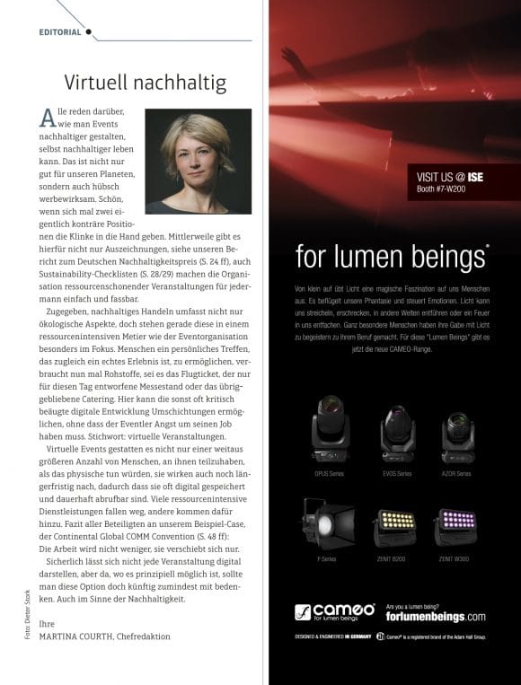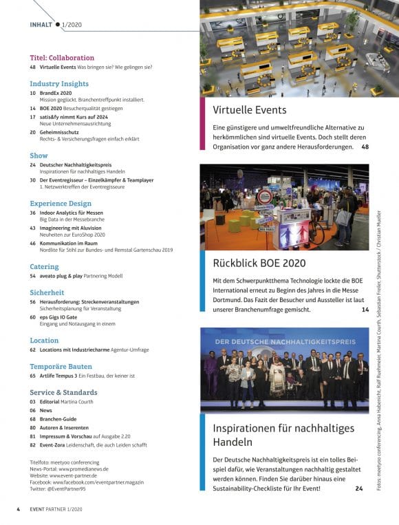Virtuelle Events +++ BOE 2020 +++ Deutscher Nachhaltigkeitspreis +++ Sustainability-Checkliste +++ Der Eventregisseur – Einzelkämpfer & Teamplaner: 1. Netzwerktreffen der Eventregisseure +++ Indoor Analytics für Messen +++ Herausforderung: Streckenveranstaltungen9,20 €