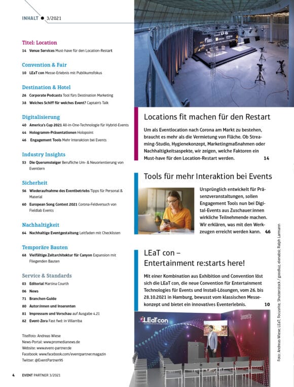 Venue Services: Must-have für den Restart | Podcasts fürs Destination Marketing I Engagement Tools Corona-Feldversuch beim ESC 2021 I Leitfaden für nachhaltige Events9,20 €