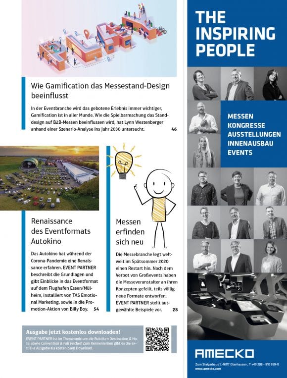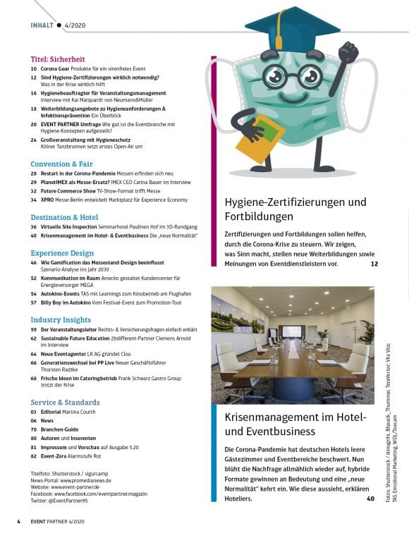 Hygiene-Zertifizierungen und Fortbildungen: Zertifizierungen und Fortbildungen sollen helfen, durch die Corona-Krise zu steuern. +++ Krisenmanagement im Hotel und Eventbusiness: Die Corona-Pandemie hat leere Gästezimmer und Eventbereiche beschwert +++ Wie Gamification das Messestand-Design beeinflusst: In der Eventbranche wird das gebotene Erlebnis immer wichtiger +++ Renaissance des Eventformats Autokino: Das Autokino hat während der Corona-Pandemie eine Renaissance erfahren. +++ Messen erfinden sich neu: Messebranche legt im Spätsommer 2020 einen Restart hin +++9,20 €