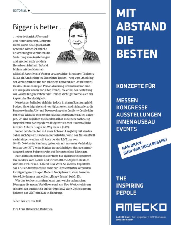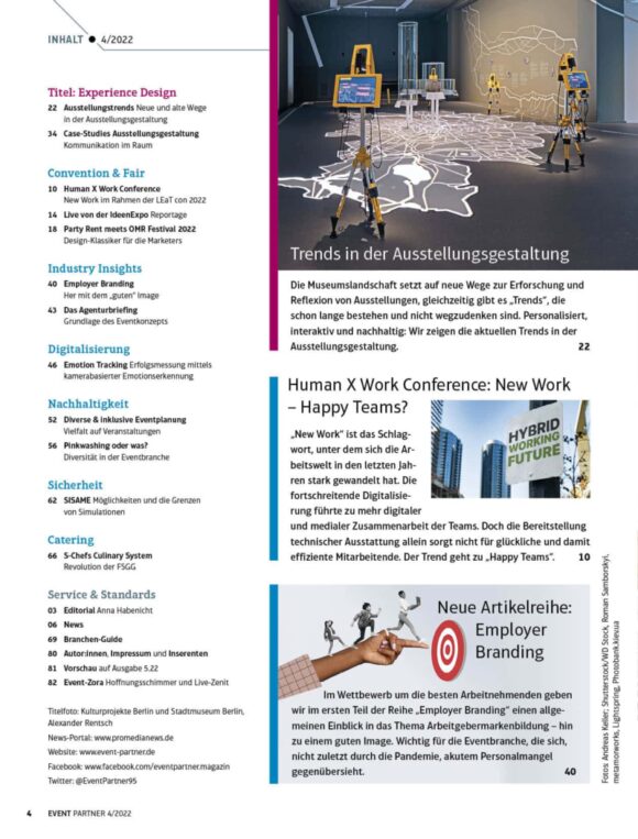 Ausstellungstrends Schluss mit der Materialschlacht | Employer Branding | New Work & Happy Teams auf der LEaT con 22 | Erfolgsmessung mit Emotion Tracking | Diversität bei der Eventplanung9,20 €