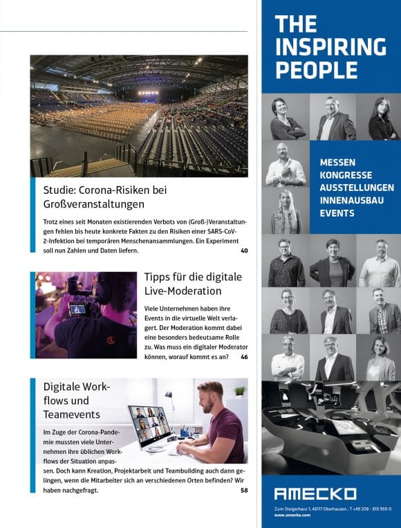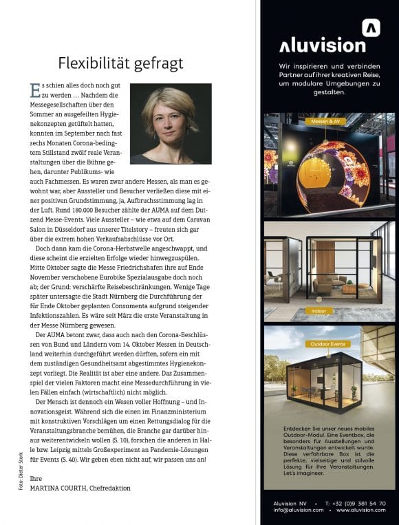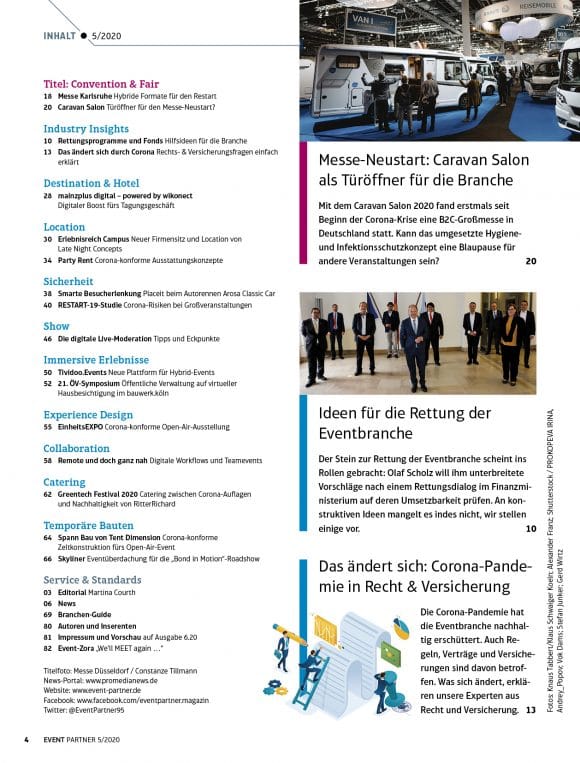 Türöffner für den Messe-Neustart? +++ Corona-Risiken bei Großveranstaltungen +++ Corona-konforme Open-Air-Ausstellung +++ Catering zwischen Corona-Auflagen und Nachhaltigkeit +++ Rechts- & Versicherungsfragen einfach erklärt9,20 €
