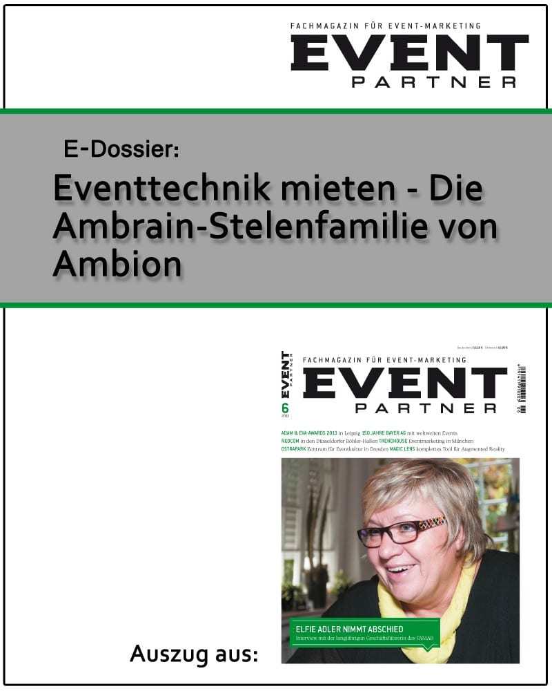 Derzeit zieht AMBION mit einer schlichten, sicheren und dabei dennoch eleganten Produktreihe die Aufmerksamkeit auf sich: Der Ambrain-Stelenfamilie! Das besondere an der neuen Eventtechnik aus dem Hause AMBION ist die Vielfältigkeit, mit der die Stelenserie in den unterschiedlichsten Umfeldern punktet. Das Portfolio der Ambrain-Stelenfamilie umfasst Beleuchtungsstelen, Display- und Lautsprecherstative sowie Rednerpulte. Da Eventtechnik mieten, in der Regel weitaus günstiger ist als der direkte Kauf, bietet AMBION die meisten Teile der Ambrain-Stelenfamilie natürlich auch zur Vermietung an. Wo und welche Artikel, erfährst du in unserem E-Dossier!