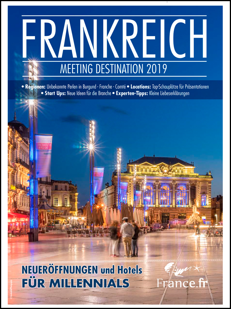 Frankreich Meeting Destination 2019 ist die aktuelle Planungshilfe für MICE-Entscheider, die sich über Neuigkeiten aus Frankreich informieren wollen. Neben einer Destinationsreportage über Burgund-Franche-Comté werden folgende Themen behandelt: